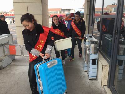 ?xml:namespace>。志愿者們身披綬帶深入各大站點(diǎn)、車(chē)場(chǎng),開(kāi)展站臺(tái)咨詢,導(dǎo)乘服務(wù),主動(dòng)扶老攜幼,為乘客兌換零錢(qián),共發(fā)放乘車(chē)指南1000余份,深受乘客歡迎。圖為賈汪公司志愿者在幫助江蘇安全技術(shù)職業(yè)學(xué)院開(kāi)學(xué)返校的學(xué)生運(yùn)送行李。
