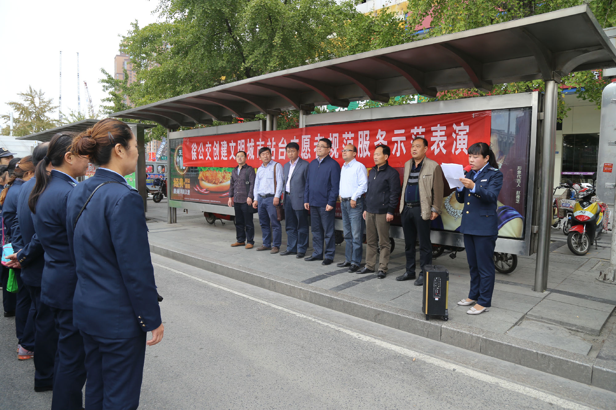 為進(jìn)一步規(guī)范站臺服務(wù)引導(dǎo)工作,不斷推動文明城市創(chuàng)建順利進(jìn)行,10月9日上午,公司在徐州站主廣場舉行了一次公交站臺秩序規(guī)范服務(wù)示范表演。團(tuán)市委副書記夏友峰、運(yùn)管處客運(yùn)科科長陳福升、以及市創(chuàng)建辦交通秩序二組三位領(lǐng)導(dǎo)蒞臨觀摩。服務(wù)督導(dǎo)隊(duì)34名站臺志愿者參加了示范表演。