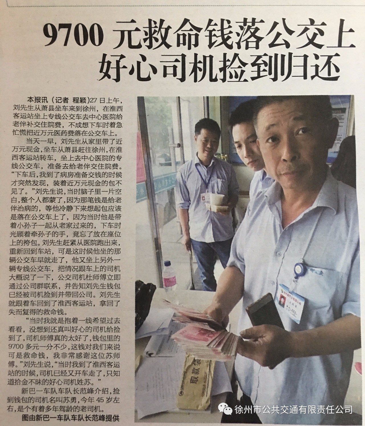 車隊管理人員打開包尋找乘客的聯(lián)系方式,發(fā)現(xiàn)包里有一個信封,信封里面裝著9700元現(xiàn)金,便立即將包妥善保管。不久,失主劉先生來到調(diào)度室尋找,看到失而復(fù)得的包裹十分激動,他說:“我抱著一線希望來這兒看看,沒想到還真叫好心的司機(jī)給撿到了,9700元一分不少。這錢對我們來說是救命錢,今早到醫(yī)院給老伴補(bǔ)交住院費的,我非常感謝蘇師傅”。