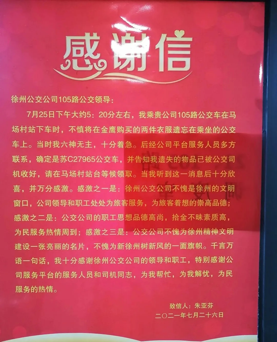 “我一時(shí)疏忽丟了東西,如果沒(méi)有袁丁師傅,我這兩套西服就不知所蹤了,真的非常感謝?!?月26日,乘客朱先生送來(lái)感謝信,對(duì)徐州公交的暖心服務(wù)表示贊許。