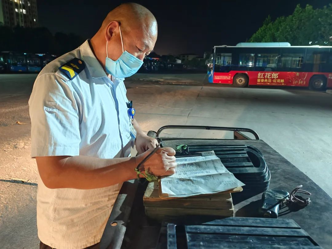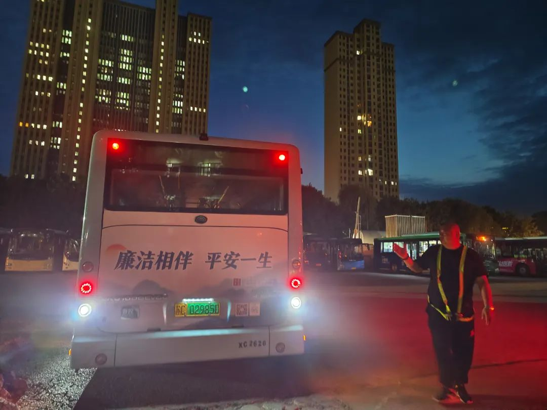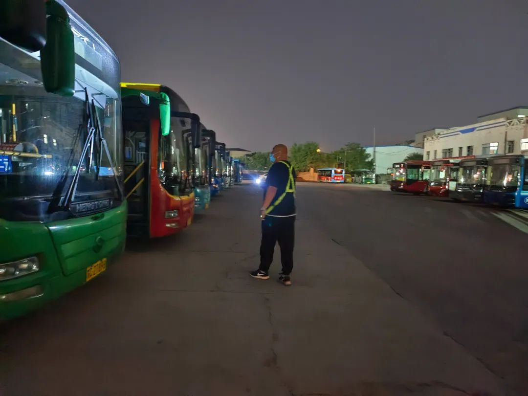 進(jìn)入丑時(shí),許多人都已進(jìn)入夢(mèng)鄉(xiāng),末班車回場(chǎng),在萬(wàn)籟俱靜的夜里,內(nèi)保員徐智指揮倒車,同時(shí)還要逐個(gè)檢查停車場(chǎng)內(nèi)的車輛擺放,匯報(bào)車輛歸場(chǎng)情況,確保車輛全部安全歸場(chǎng)。