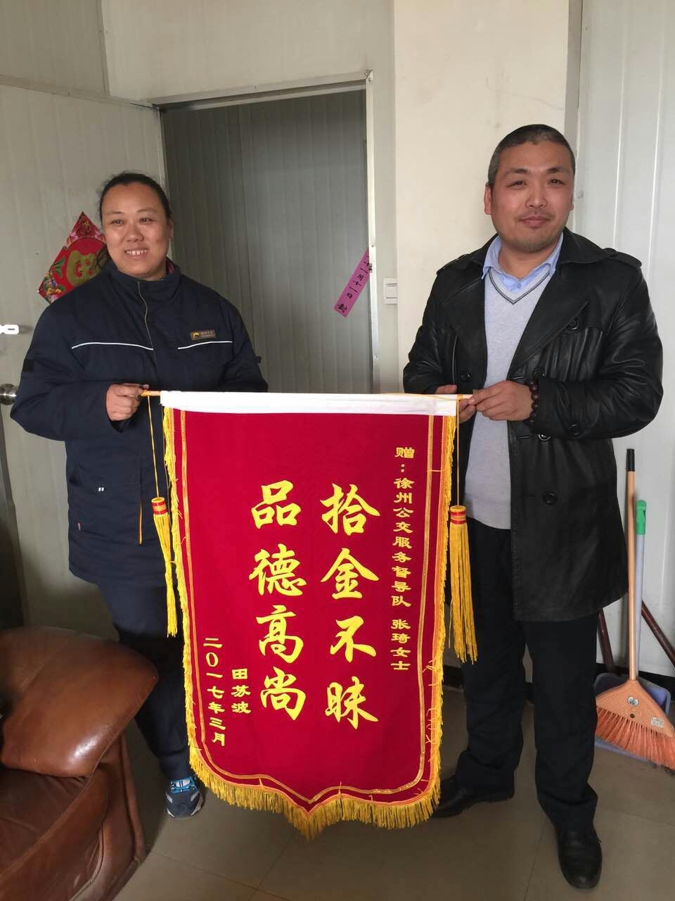 3月29日,正在站臺執(zhí)勤的督導(dǎo)員張琦撿到乘客掉落的公文包,經(jīng)查看發(fā)現(xiàn)包內(nèi)有蘋果筆記本一臺和一個錢包,但并沒有找到皮包主人的聯(lián)系方式。張琦把包放在了調(diào)度室等待失主來認(rèn)領(lǐng),約一小時后失主匆忙趕來尋找。失主見到失而復(fù)得的皮包非常激動,經(jīng)過詢問得知失主姓田在徐州礦業(yè)大學(xué)工作。田先生說,“電腦里存有非常重要的資料和聯(lián)系方式,丟包之后萬分焦急,真心感謝公交督導(dǎo)員。”隨即從錢包里拿出400元錢塞給張琦作為答謝,張琦表示:“路不拾遺本就是自己的義務(wù),作為站臺督導(dǎo)員經(jīng)常會在站臺撿到乘客掉落的物品,不管東西貴重與否我們都會幫失主妥善保管等待認(rèn)領(lǐng)?!?/span>3月31日,田先生和他的愛人送來錦旗表示感謝!